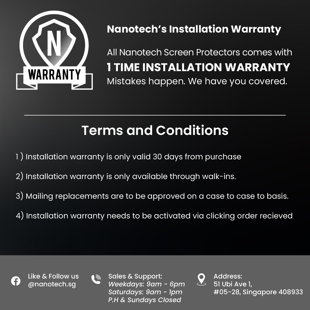 1 time installation warranty comes with all NANOTECH Screen Protectors.